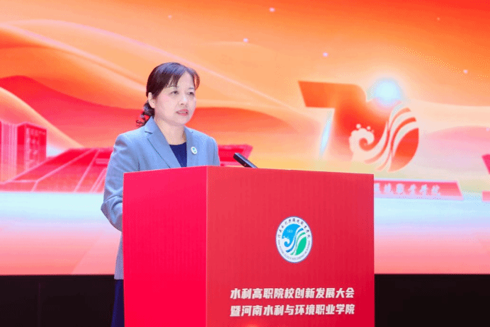 随后,校长李志萍发表了题为《深耕水利职教七十载 谱写创新发展新篇章》的工作报告。她系统梳理了学校从“因水而建”的初创期、“依水而兴”的发展期到“循水而进”的跨越期的奋进历程。从百业待兴的1955年到全面振兴的2025年,河南水环学院三迁校址、八易校名,在水利事业和职业教育事业由小变大、由弱变强的历史进程中,走过了初心如磐、薪火相传、求实奋进的70年。